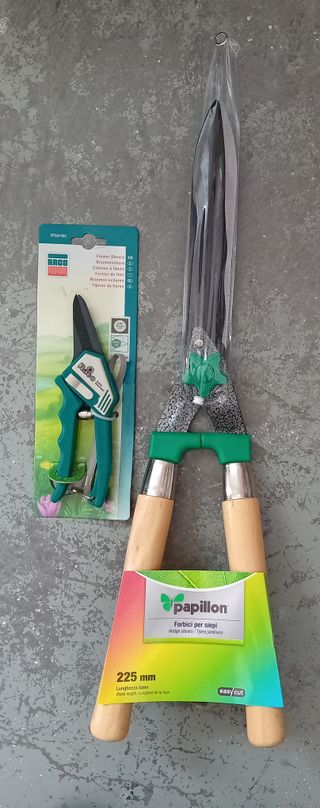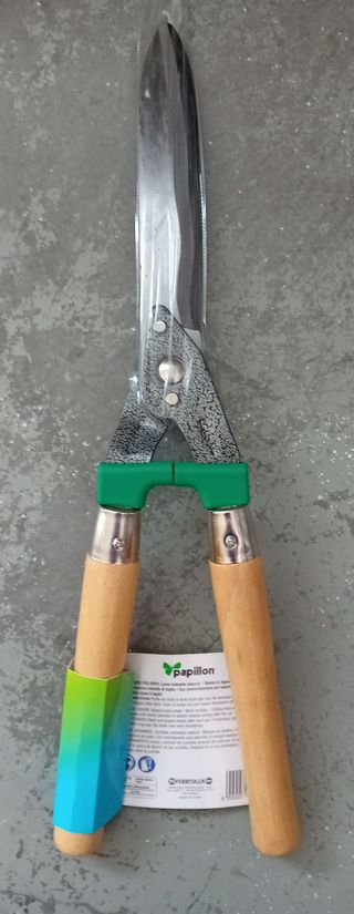 2 Tijeras podar setos y ramas, compuesto por: - 1 Tijeras Podar Setos 2 Manos - Medida: de 54 cm. - Cuenta con un pomo de ajuste de corte, diámetro máximo de corte: ø 15 mm. - Hoja superior de corte realizada en acero SK-5 con recubrimiento antiadherente para un corte limpio. - Hoja inferior de corte con alto contenido en carbono con acabado pulido. - Ambas hojas tienen un filo ondulado para facilitar el corte de las ramas. - Mangos realizados en madera. - 1 Tijera corte ramas 1 mano - Diámetro máximo rama: 16mm - Hojas de acero, con acabado de teflón-S, resistentes a la fricción y al oxido.