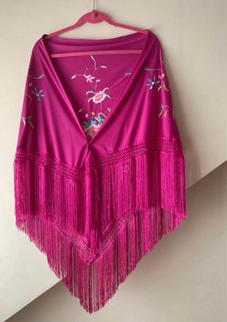 Elegante mantoncillo con bordados florales y flecos. - Diseño triangular. - Bordado detallado de flores. - Flecos largos en todo el borde.