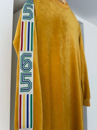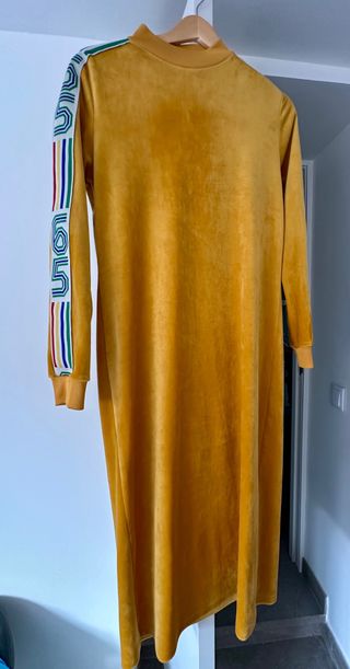 Vestido largo de terciopelo en color mostaza. Presenta detalles de banda deportiva en las mangas. - Material: Terciopelo. - Diseño: Banda deportiva con logo en las mangas. - Largo: Hasta los tobillos.