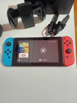 Consola Nintendo Switch en buen estado con Joy-Cons en azul y rojo. - Caja original de la consola - Dock - Cable para cargar la consola y HDMI - Dos joycon aparte con sus accesorios - Funda de Mario Odissey