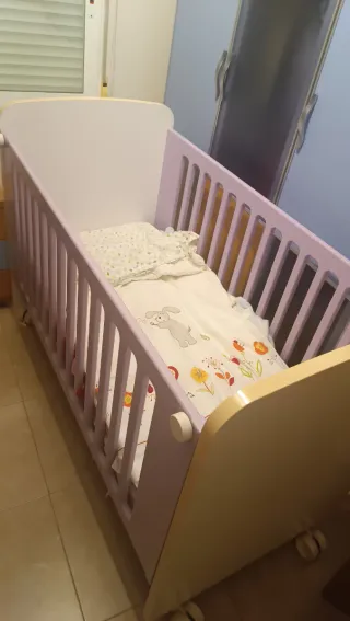 Cuna para bebé con ruedas, fácil de mover. Medidas 150x80x110altura - Estructura de madera. - Laterales de barrotes Puerta elevable Sin ropa