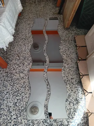 Conjunto de dos espejos con un diseño ondulado único y moderno. Añaden un toque de estilo a cualquier espacio. - Forma de onda. - Ribete superior naranja.