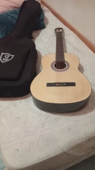 Guitarra clásica de tamaño estándar, ideal para iniciarse en la música. Incluye funda. - Cuerpo de madera clara. - Diapasón con trastes. - Cuerdas de nylon.