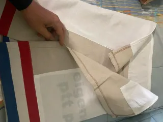 Saco costal de estilo holandés, sin estrenar. - Diseño con franjas rojas y azules. - Material de lona resistente. - Detalle de etiqueta impresa.