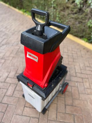 Biotrituradora eléctrica Hecht 624 Box en buen estado, con poco uso. Trituradora de jardín. - Modelo: Hecht 624 Box - Potencia: 2500 W - 230 V/50 Hz - Capacidad de corte: diámetro máximo de 40 mm (dependiendo de la madera). - Color: Rojo y negro - Incluye caja recolectora de 50 litros. - Peso: 14 kg - Chasis con rueda - Solo 3 usos el año pasado - Precio nuevo: 215 €