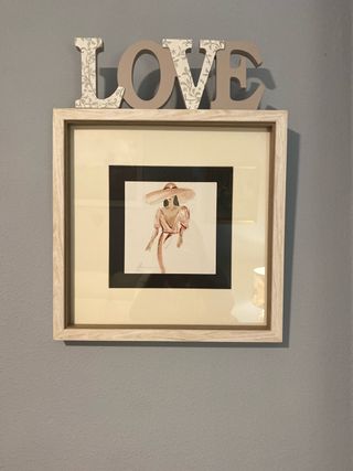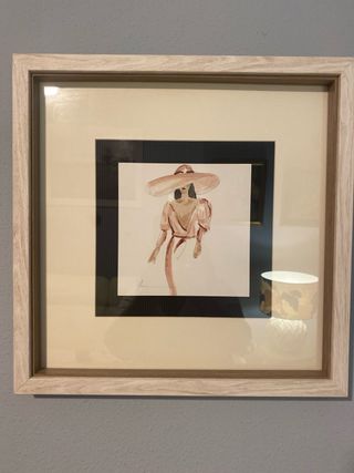 Precioso cuadro con un diseño elegante de una mujer con sombrero. Ideal para añadir un toque de estilo a cualquier habitación. - Marco de madera con acabado envejecido. - Ilustración en tonos beige y marrón. - Papel de alta calidad.