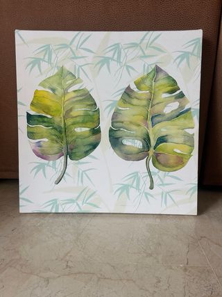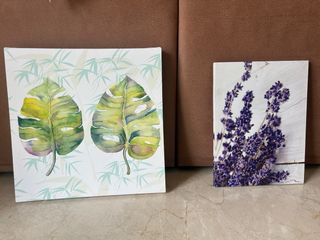Conjunto de dos cuadros decorativos con motivos botánicos. 45x3x45 - Un cuadro presenta dos hojas grandes de estilo acuarela sobre un fondo de bambú. - El otro cuadro muestra un ramo de lavanda sobre un fondo de madera. 40x2x30cm