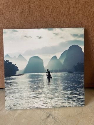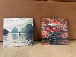 Conjunto de dos cuadros decorativos, perfectos para añadir un toque artístico a tu hogar. - Un cuadro muestra un paisaje de montañas con un río y una barca. - El otro cuadro presenta un templo japonés rodeado de árboles de otoño.