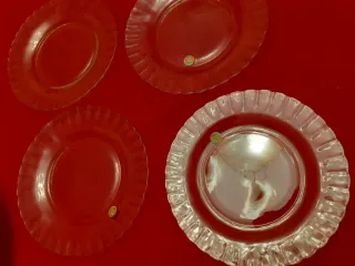 4 platos nuevos Duralex con un diseño elegante, moderno. - Fabricados en cristal resistente. - Borde ondulado decorativo. - Color transparente con un ligero tinte rojizo.