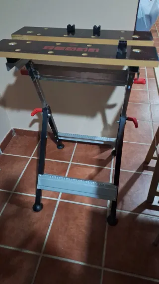 Mesa de trabajo plegable de la marca GS. Ideal para proyectos y tareas. - Estructura metálica resistente. - Superficie de madera. - Plegable para fácil almacenamiento y transporte. - Incluye mordazas y topes para sujeción.