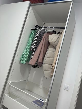 Armario de hogar con diseño moderno y funcional. - Acabado en color blanco. - Incluye cuatro cajones de gran capacidad. - Dispone de una cesta metálica superior. - Puertas correderas. Precio negociable