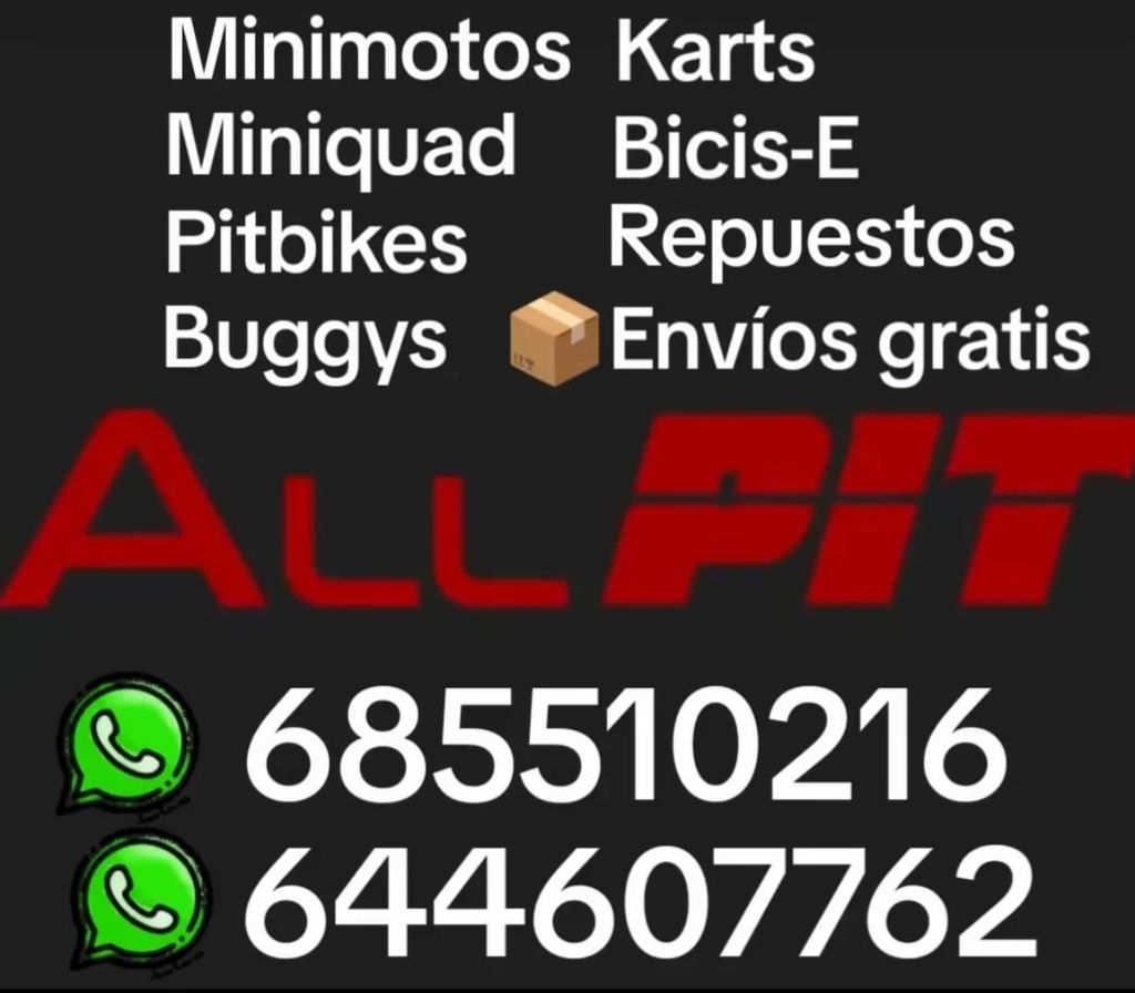 Acerca deALMACENES #Allpit.com#TLF:685 510 216--644 607 762.TENEMOS LOS MEJORES PRECIOS DE FABRICANTE DE ESPAÑA. COMPRUEBALO TU MISMO.VENTA Y ENVIOS PARA TODA ESPAÑA.MINIMOTOS,MINIQUADS,GASOLINA,ELECTRICOS,PITBIKES,BUGGYS,KARTS,REPUESTOS,EQUIPACIONES...