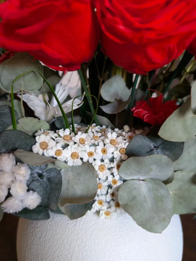 Centro floral con rosas blancas preservadas