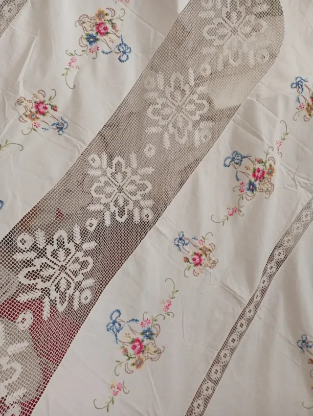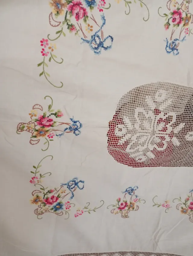 Mantelería bordada floral y encaje. Punto de cruz