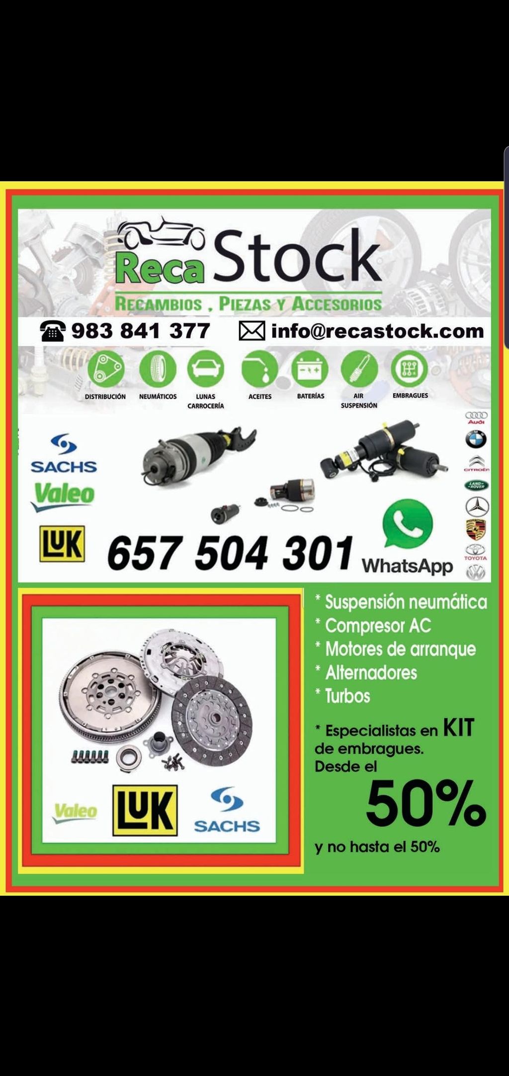 Acerca deAlmacen de Recambios de Automoción con más de 20 años de experiencia en el sector , especializado en Suspensión Neumática. Embragues . Turbos, inyectores y bombas. También disponemos de kit de distribución. Alternadores Arranques Compresores A/C...