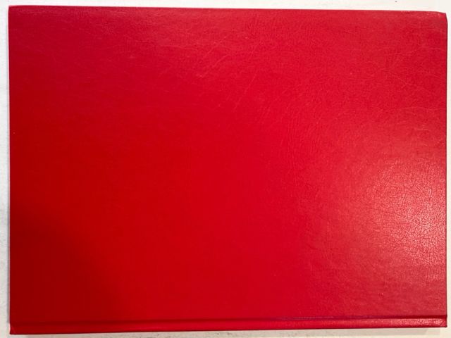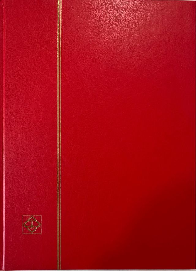 Álbum de sellos rojo con detalles dorados. 16 pag.