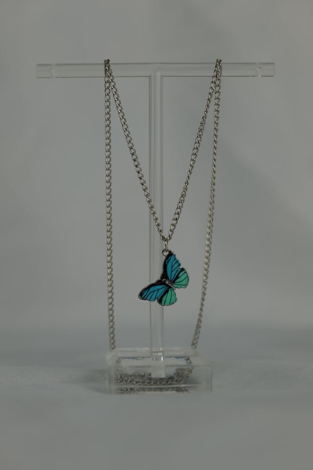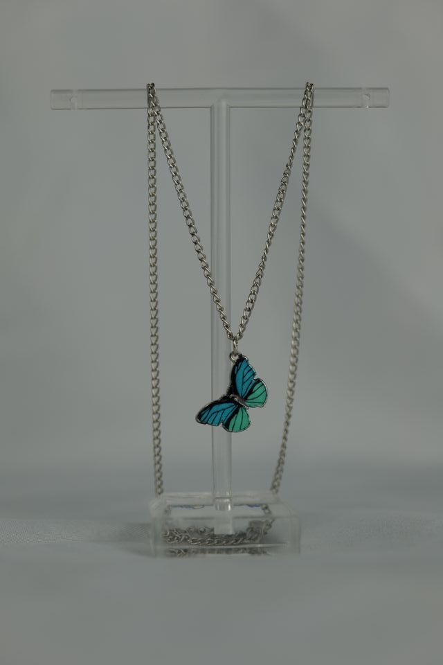 Collar Mariposa Azul y Verde Cadena Plateada