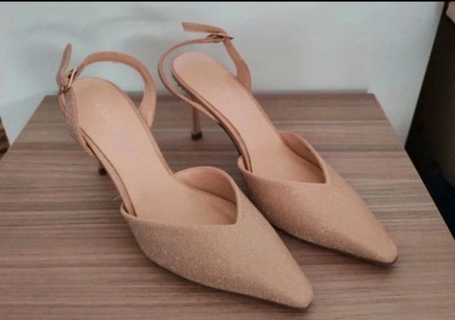 Zapatos de tacón dorados y rosas con pedrería