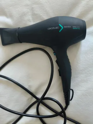 Secador de pelo Cecotec con tecnología Ionicare. - Potencia de 2600W. - Diseño en color negro con detalles en verde azulado. - Tiene algún arañazo como se ve en las fotos por el uso. - Incluye boquillas de alisado y difusor. Enseño sin compromiso.