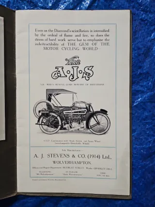 Catálogo original de AJS Motor Cycles del año 1915. Presenta información sobre los modelos de 2 y 3 velocidades. 40 PAGINAS INGLES - Diseño de época. - Ilustración de ángel con alas. - Texto en inglés.