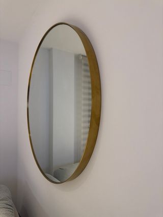 Elegante espejo redondo con un diámetro de 100cm. - Marco metálico en acabado dorado. - Diseño moderno y versátil.