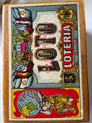 Caja vintage francesa LOTO de madera – decoración retro. Bonita caja de madera con ilustración clásica del juego “Loto” francés (tipo bingo). Diseño vintage inspirado en los antiguos carteles de lotería europeos, con figura de Atlas y escudos decorativos. Interior amplio para guardar cartas, fichas, objetos o como caja decorativa. Fabricada en madera con bisagras metálicas. Muy decorativa para escritorio, salón o colección retro. Medidas: 22 X 15 X 11. Estado general bueno, con marcas normales del paso del tiempo visibles en las fotos. Ideal para decoración vintage, coleccionismo, juegos antiguos o estilo retro francés.