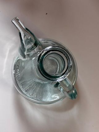 Bonita aceitera antigua de cristal soplado con doble pico vertedor y asa lateral, de estilo tradicional mediterráneo. - Fabricada en vidrio grueso ligeramente verdoso, con las pequeñas irregularidades típicas del vidrio soplado artesanal. - Muy práctica para aceite de oliva, vinagre o aliños. - Forma redondeada y base estable. - Pico vertedor curvo. - Borde superior acanalado. También queda muy bien como pieza decorativa rústica en cocina o mesa. Diseño clásico usado durante décadas en casas y restaurantes. Perfecta para cocinas rústicas, casas de campo o decoración mediterránea.