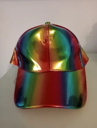 Gorra con un diseño llamativo y brillante. - Acabado metálico iridiscente. - Patrón de rayas de colores.