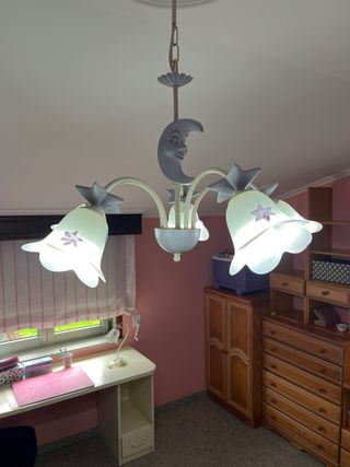 Lámpara de techo infantil con un diseño encantador de luna y estrellas. Perfecta para una habitación. - Estructura en color crema y detalles en gris claro. - Tres tulipas con motivos de estrellas. - Adorno central en forma de luna con una figura. - Colgante decorativo en la cadena.