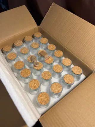 Más GANGAS EN MI PERFIL Frascos transparentes con tapón de corcho, sin usar. Ideales para detalles de boda o eventos, manualidades, regalos, especias, sales, semillas o decoración. Incluyen cordón y etiquetas para personalizar cada frasco. Tamaño pequeño y elegante, quedan muy bien presentados. Se entregan nuevos, completos y en su embalaje original, tal como se ve en las fotos.