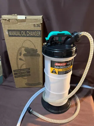 Más GANGAS EN MI PERFIL Bomba manual para extracción y cambio de aceite sin desmontar nada. Ideal para coches, motos, cortacésped, generadores y maquinaria. Capacidad 5,3 litros, funcionamiento manual (no necesita electricidad). Incluye mangueras para aspirar el aceite de forma limpia y rápida. Base estable y asa superior para un uso cómodo. Se entrega nuevo, sin usar, con su caja original y accesorios, tal como se ve en las fotos.
