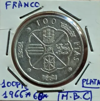 Moneda conmemorativa de 100 pesetas de la época de Franco. - Año: 1966. - Material: Plata. - Diseño: Escudo de España. - Inscripción: PTAS.