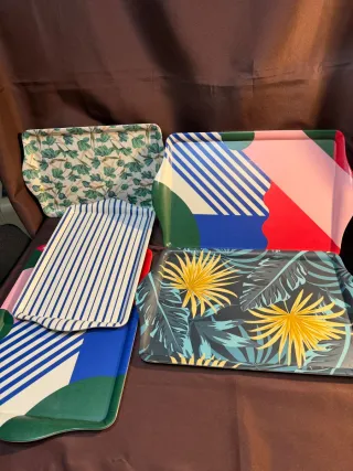 Más GANGAS EN MI PERFIL Bandejas nuevas a estrenar, resistentes y muy chulas. Ideales para servir, decorar, desayunos en el sofá como un rey… o para dejar las llaves. 📏 Tamaños y precios: 🔹 Pequeñas (2 unidades) ➡️ Medidas: 24 cm ancho x 39 cm largo 💰 3 € cada una 🔹 Grandes (3 unidades) ➡️ Medidas: 29 cm x 47 cm 💰 4 € cada una 🎨 Diseños modernos y variados (tal como se ven en las fotos). 🆕 Estado: NUEVAS, sin uso.