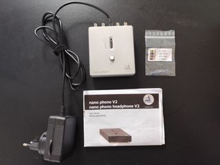 Preamplificador de fono high end Clearaudio nano phono V2. - Fabricado en Alemania. - Buen estado estético y funcional. Robusto y fiable. Poco uso. - Incluye fuente de alimentación, manual, tarjeta registro y garantía, bolsita con resistores y embalaje original. - 85x106x25 mm. 500g.
