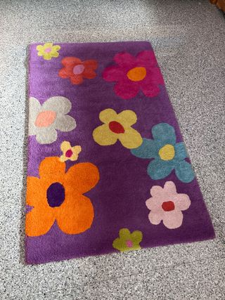 Alfombra de lana con un alegre diseño de flores en varios colores sobre un fondo morado. Perfecta para añadir un toque divertido a cualquier habitación. - Diseño floral vibrante. - Tacto suave y agradable.