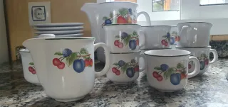 Conjunto de vajilla para café con un diseño alegre de frutas. - Jarra para el café. - 11 pocillos de 6 cm de altura. - Platillos a juego. - Azucarero con tapa y lechera.