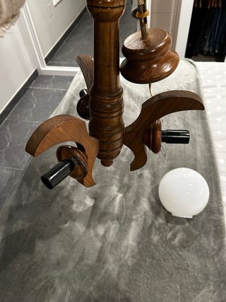 Lámpara de techo con un diseño rústico y elegante, combinando madera (Solo conserva 1 tulipa de cristal)