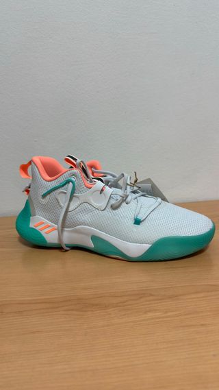 Zapatillas de baloncesto Adidas Harden Stepback 3 en talla 45 1/3. Diseñadas para un rendimiento óptimo en la cancha. - Color blanco con detalles en coral y verde azulado. - Cierre de cordones. - Suela de goma para mayor tracción.