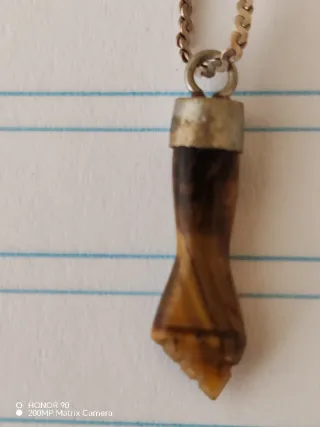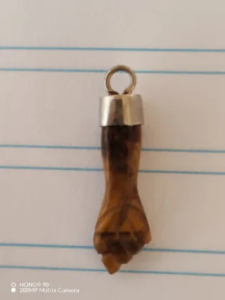 Colgante con forma de ojo, conocido como ojo de la envidia. - Material: Piedra natural (posiblemente ojo de tigre). - Montura metálica.