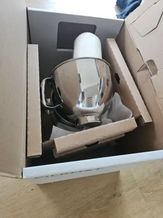 KitchenAid ARTISAN color beige. Funciona perfectamente. Para masas duras a veces sale y por eso ha causado daño en la máquina. Con el bol pequeño se puede trabajar perfectamente. Los daños en la maquina son superficiales. Viene con los accesorios que se ven en la primera foto. Se puede hacer precio pack con los accesorios. 1 bol grande de regalo que no encaja bien en la base de la máquina.
