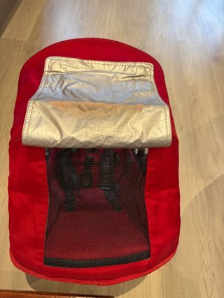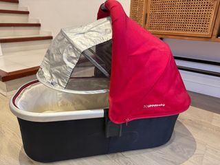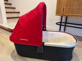 Capazo para carrito Uppababy Vista en color rojo. Ideal para los primeros meses del bebé. - Capota extensible. - Interior acolchado. - Asa de transporte. -proteccion solar incluido -proteccion de mosquitos incluido -tiene mancha