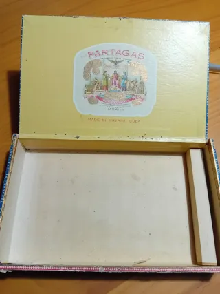 Caja de colección de la marca Partagás.Hecho en Cuba , más de 50 años, vacía. Medidas 23x14x4 - Diseño con fondo amarillo y detalles dorados. - Incluye etiquetas y sellos originales.