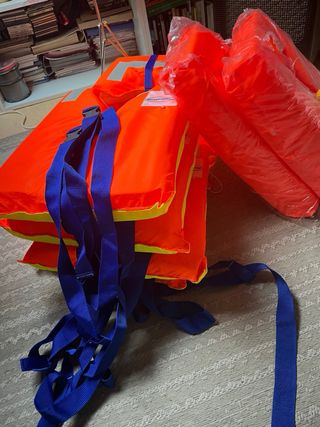Chaleco salvavidas de color naranja brillante, con cintas de ajuste azules y detalles reflectantes. Talla M (Adultos) Nunca se han usado! 10€ cada uno! 4 chalecos Salmar de 150 N 2 chalecos Plastimo de 150 N - Cierre con hebillas. - Tiras de sujeción ajustables. - Detalles reflectantes en la parte superior.
