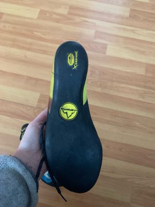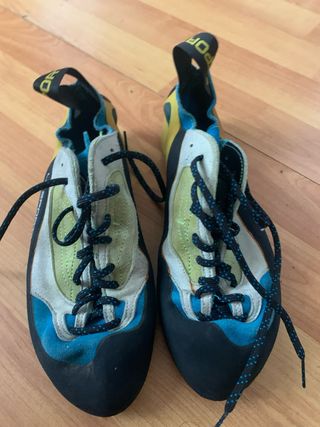 Pies de gato La Sportiva para escalada. - Talla 40.5. - Cierre con cordones. - Diseño en colores azul, amarillo y blanco.