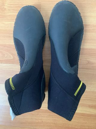 Botas de neopreno de la marca Decathlon, ideales para surf. Talla 40. - Material de neopreno. - Suela de goma. - Detalle de costuras amarillas.