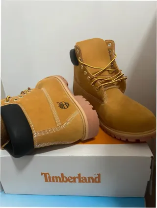 Botas Timberland clásicas en color marrón y amarillo. - Talla 46. - Diseño icónico. - Cordones bicolor.