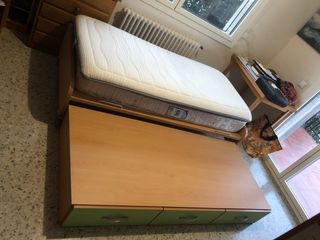 Cama individual tipo nido con espacio de almacenamiento. Se tiene que venir a buscar entre dos personas, la cama ya está desmontada! La medida mas larga es 190cm. - Estructura de madera. - Cajones frontales de color verde. - Ruedas para facilitar el movimiento -COLCHÓN INCLUIDO
