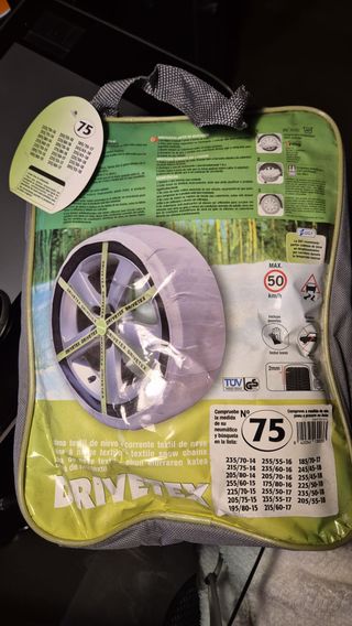 Fundas textiles para la nieve DRIVETEX, talla 75. Son una alternativa a las cadenas tradicionales. NUEVAS- SIN USO - Incluye bolsa de transporte. - Fabricadas en material textil. - Homologadas TUV GS. - Velocidad máxima recomendada: 50 km/h.