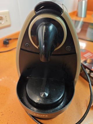 Cafetera Nespresso Krups de color beige y negro. Ideal para preparar tu café favorito. - Modelo Nespresso. - Marca Krups. - Le falta la bandeja de apoyo del vaso.