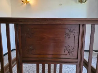 Estructura de cama antigua de madera con diseño clásico. - Cabecero y piecero con detalles de listones. - Fabricada en madera maciza, robusta y en perfecto estado. Incluye los listones para apoyar el colchón, aunque no salen en las fotos. Medidas. Ancho 110 cm, Largo 203 cm, Altura del Cabecero 115 cm A recoger en Santa Brígida